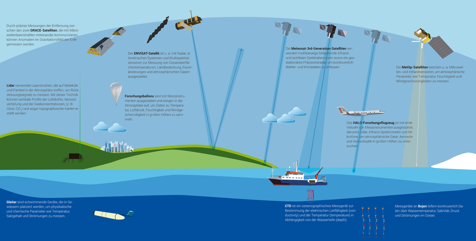 Die Erkundung der Erde hat zu einem umfassenden Verständnis unseres Planeten geführt, das im Abschnitt „Unsere Erde“ ab Seite 102 ausführlich dargestellt ist. Im Folgenden erfahren Sie, welche Methoden heute verwendet werden, um die dramatischen Veränderungen unserer Heimat zu überwachen, aber auch so alltägliche Fragen zu klären, wie das Wetter am nächsten Tag wird. Die Messungen werden dabei nicht nur vom Erdboden aus vorgenommen, sondern auch auf See, an Bord von Flugzeugen und mit Satelliten. Mit ihnen wird sowohl das Bild des globalen Klimawandels abgebildet, als auch vor Geo-Gefahren gewarnt und die Luftqualität überwacht.